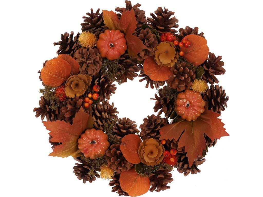 Nechte naplno vplout krásu podzimu do vašeho prostoru, díky stylovému věnci se šiškami o průměru 34 cm. Věnec je dokonalým spojením přírodních prvků podzimního období, včetně šišek, oranžového listí, bobulí a dýní, které dodávají zvláštní půvab a pestrobarevnost. Jeho oranžový nádech přináší typický podzimní styl, který se bude vyjímat. Vhodný je jako dekorace na zeď, dveře i na stůl. Jako umělý vydrží na věky, a můžete ho tak používat k ozdobě opakovaně a bez obav, že by ztratil kousek ze své krásy.