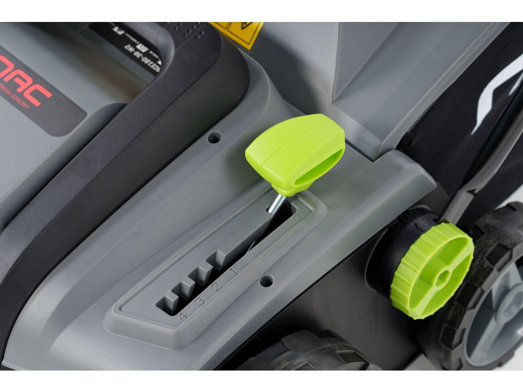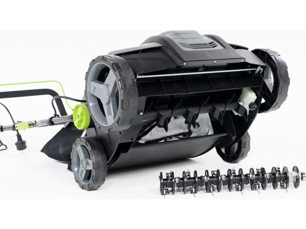 Pracovní hloubku si nastavíte pomocí páčky v rozsahu od 9 do -13 mm, stroj tedy můžete použít na nejrůznějších typech půdy. Do sběrného koše se vejde až 55 litrů trávy. Pohodlnou práci vám zajistí měkké rukojeti. Na těle vertikutátoru také najdete madlo pro pohodlnější přenášení stroje.