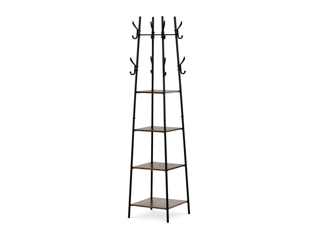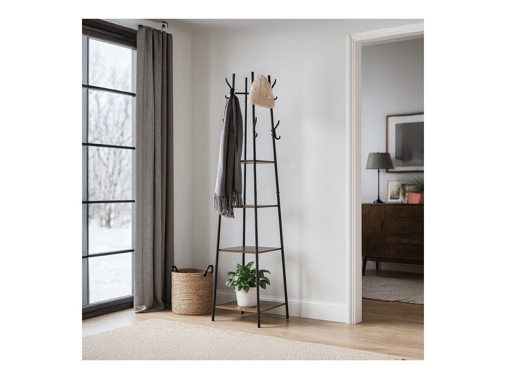 Věšák značky Autronic s praktickými policemi a industriálním designem je ideálním řešením pro organizaci a dekoraci vaší předsíně nebo ložnice. Kombinace dekoru starého dřeva a černého kovového rámu dodává interiéru moderní charakter. Čtyři prostorné police nabízí dostatek místa pro odkládání doplňků, klobouků nebo bot, zatímco háčky umožňují zavěšení kabátů a tašek. Tento multifunkční kousek spojuje styl a praktičnost, což ocení každý, kdo hledá designový a účelný doplněk pro svůj domov.