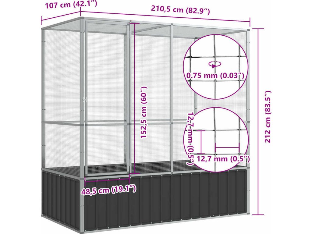 - Pevný rám: Ocel je mimořádně tvrdý a pevný materiál. Zajišťuje pevnost a stabilitu. Pozinkování poskytuje lepší ochranu proti korozi a je užitečné pro výrobky, které se budou používat venku i v drsném prostředí. Díky robustní konstrukci z pozinkované oceli vydrží tato ptačí voliéra opravdu dlouho.