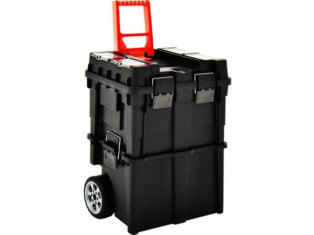 Box na nářadí je navíc vybavený solidními kolečky a uživatelsky příjemnou rukojetí, takže není problém nářadí kamkoliv dopravit. Praktický stohovatelný design umožňuje používat 2 boxy na nářadí odděleně.
