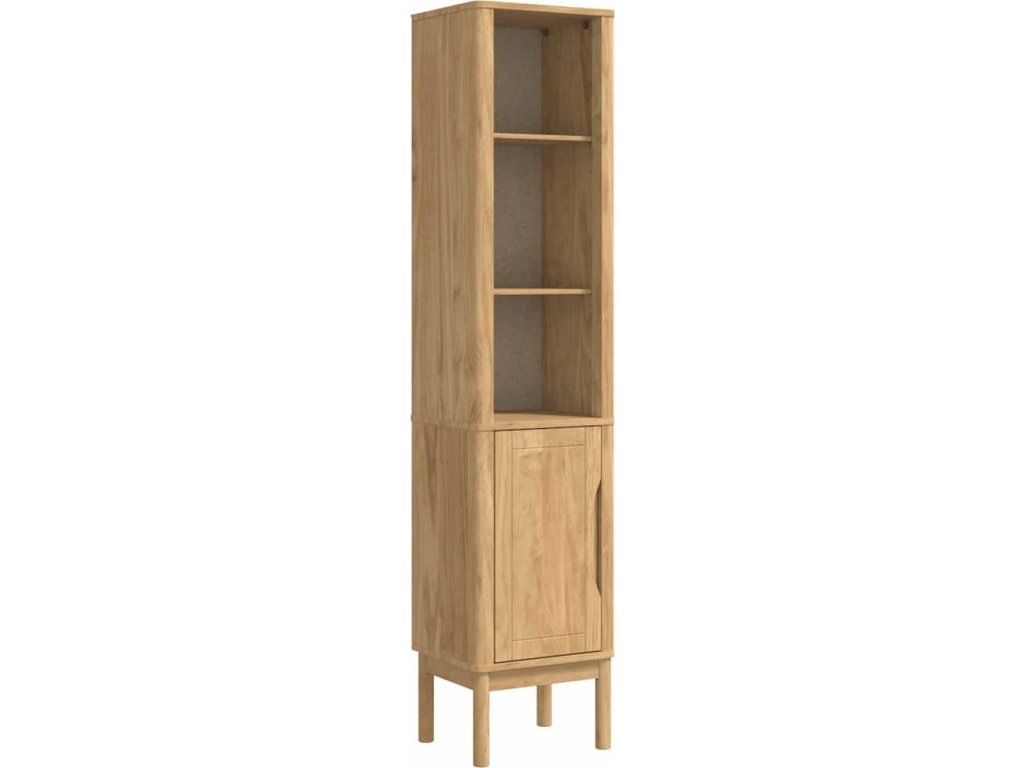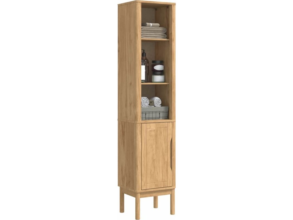 - Masivní borové dřevo: Každý kousek skříně, od rámu po nastavitelné police, je vyrobený z robustního masivního borového dřeva, což zajišťuje trvanlivost a přirozený vzhled. Krásné letokruhy borovice dodávají sofistikovanost a garantují, že skříň vydrží i ve vlhkém prostředí koupelny.