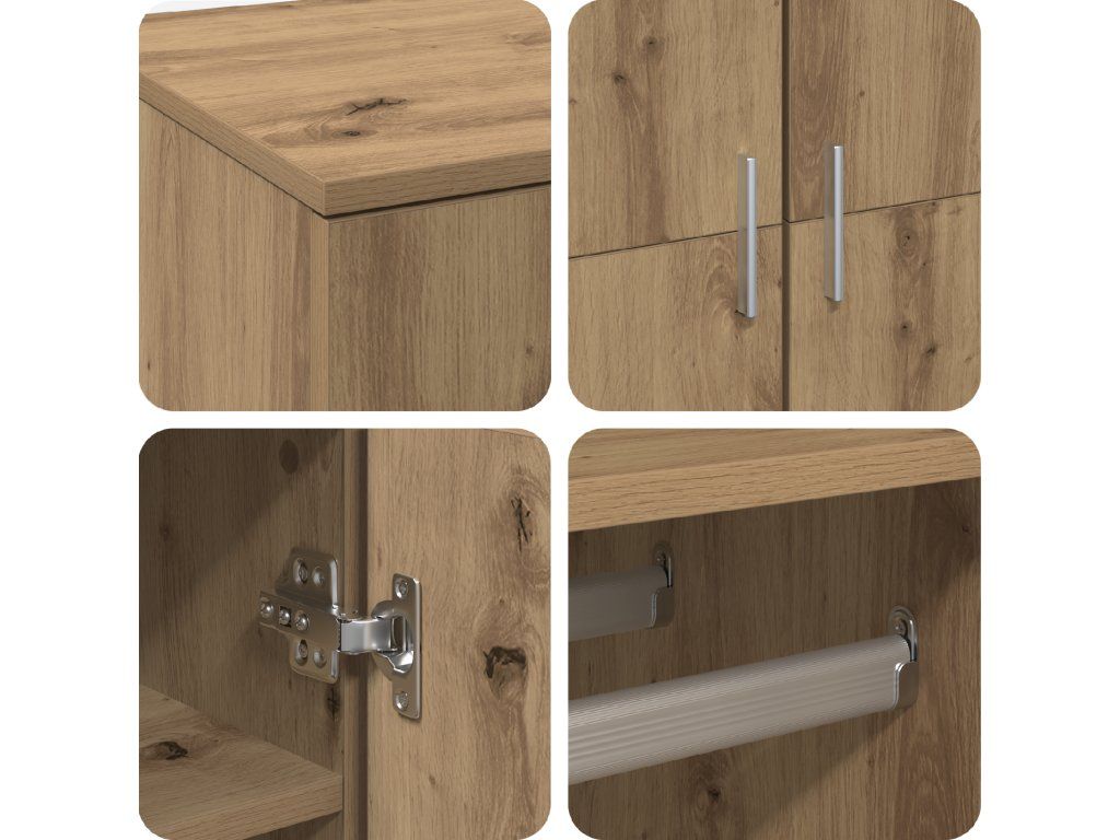 - Materiály: Tato skříň je většinou z kompozitního dřeva – je odolná a vypadá skvěle. Kompozitní dřevo je známé svou pevností a hladkým povrchem, který vydrží roky. Silná konstrukce zajišťuje, že ji bez problému používáš každý den.
