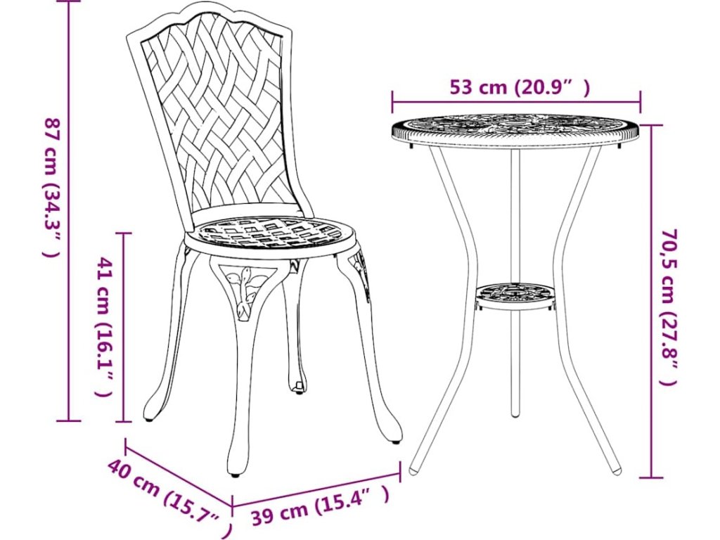 - Komponenty sady Obsahuje stůl o rozměrech 53 x 53 x 70,5 cm a dvě židle 39 x 40 x 87 cm, které k sobě ladí jak funkcí, tak vzhledem pro skvělé venkovní stravování.