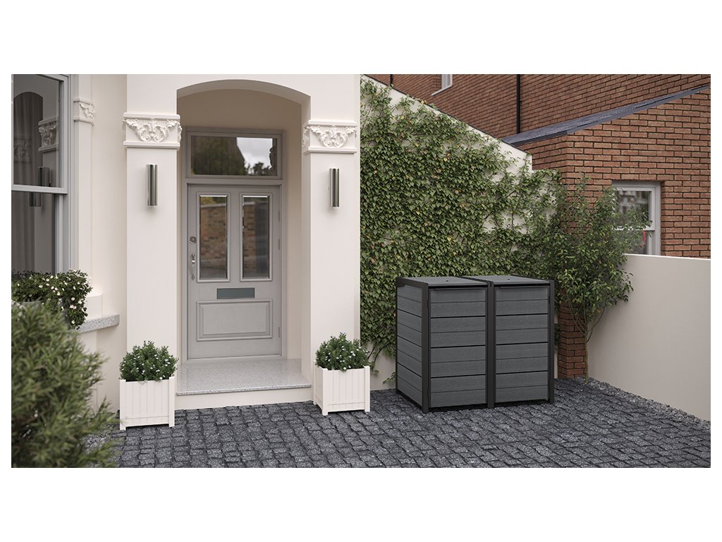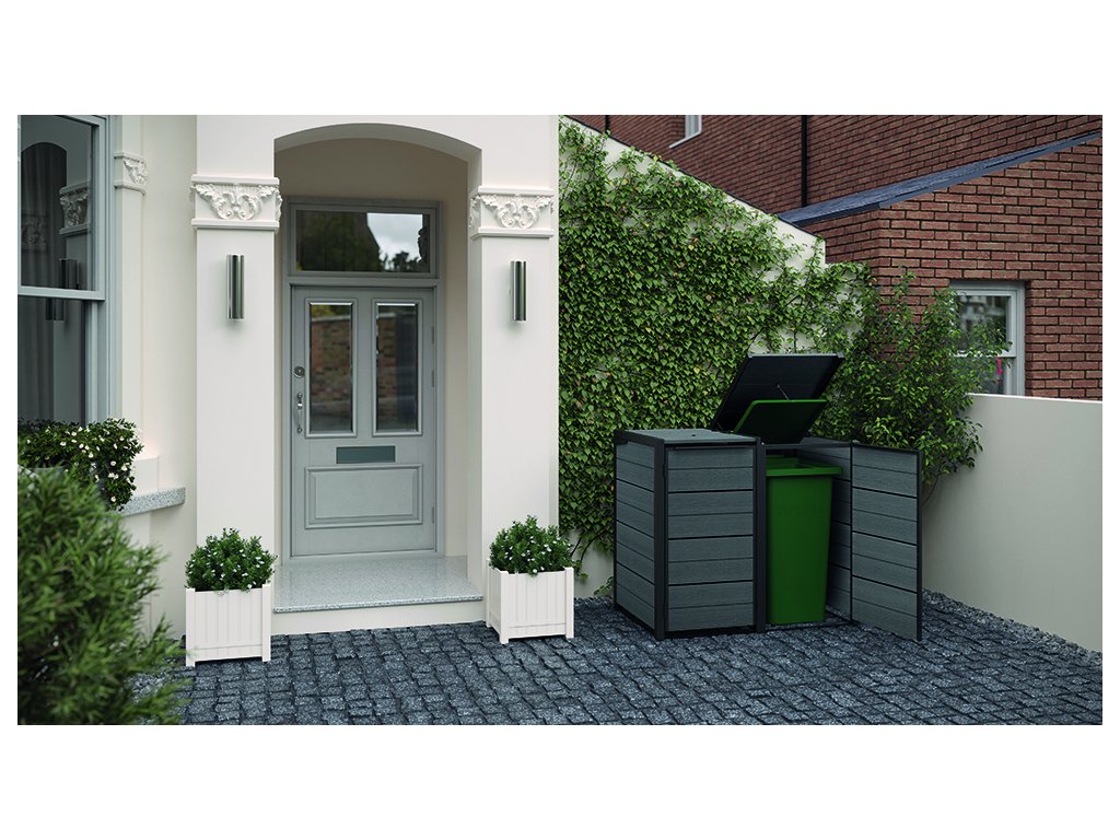 Najděte pro box ideální místo před domem, na zahradě nebo na dvoře. Díky struktuře, která připomíná dřevo, zapadne do každého prostředí. Box je vybavený odolnými kovovými panty. Aby byl více stabilní, můžete ho ukotvit k základně.