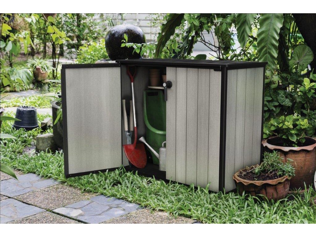 Vnitřní prostor poskytne dostatek úložného místa pro nábytek i polštáře, zahradní náčiní, bazénovou technologii a vybavení nebo sekačku na trávu. Tenká polička jde zcela vyjmout. Pevná střecha je ideální pro umístění květináčů, reproduktorů nebo zahradního nářadí.