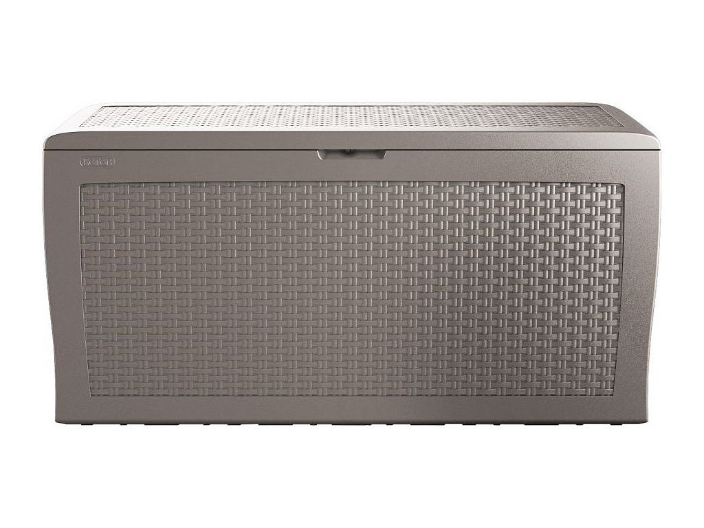 Zahradní box je vyrobený z vysoce kvalitní polypropylenové pryskyřice v moderním designu, který imituje strukturu přírodního ratanu. Skříň je nízká a její dno zvládne unést až 30 kg nákladu a víko vydrží zatížení až 150 kg, takže je ideální i pro skladování podstatně težších věcí. Stěny jsou vyztužené žebrovými segmenty, takže skříň hravě odolá i drsnému zacházení a vandalismu a nevadí ji ani extrémní počasí či UV záření.