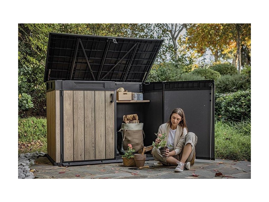 Zahradní box je vybavený podlahou a dvojitými dvířky. Snadno a bez přebytečné námahy dovnitř umístíte i větší předměty. Do boxu se ovšem dostanete i z horní strany. Otevřete víko pomocí hydraulických pístů a nerezových kovových pantů s úhlem až 180°.