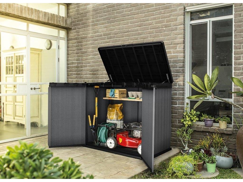 Najděte pro box ideální místo na zahradě. Díky struktuře, která připomíná dřevo, zapadne do každého prostředí. Uložené věci navíc můžete uzamknout uvnitř boxu pomocí visacího zámku (není součástí balení). Navíc je vybavený zabudovanou ventilací, která chrání věci před vlhkostí.