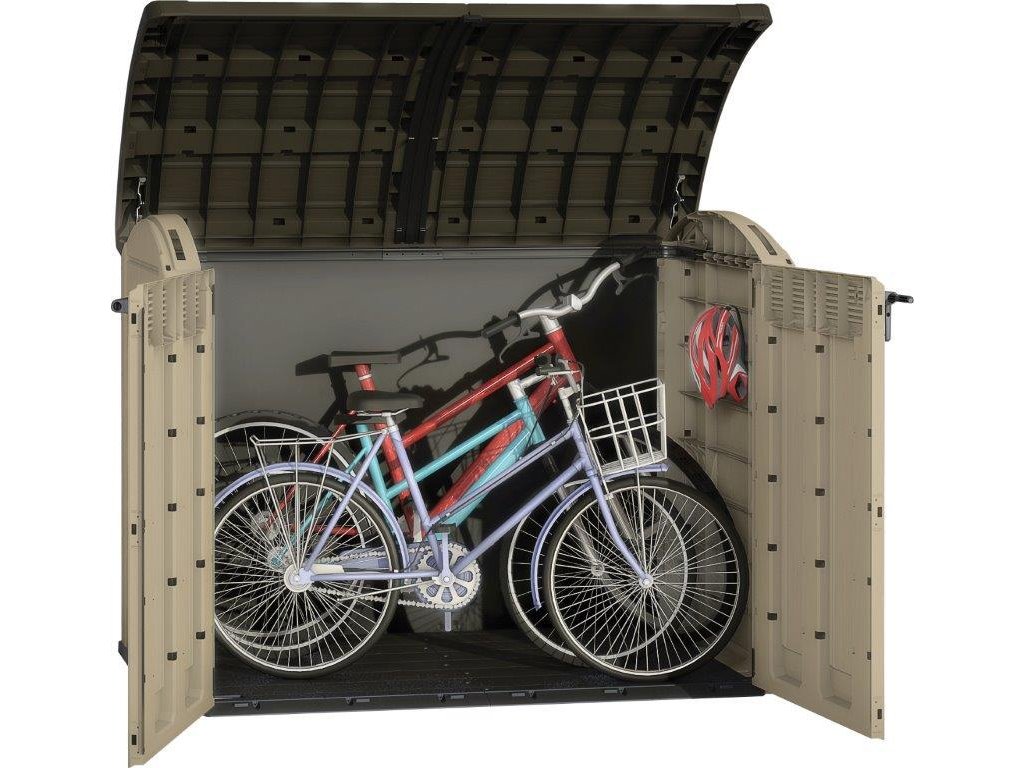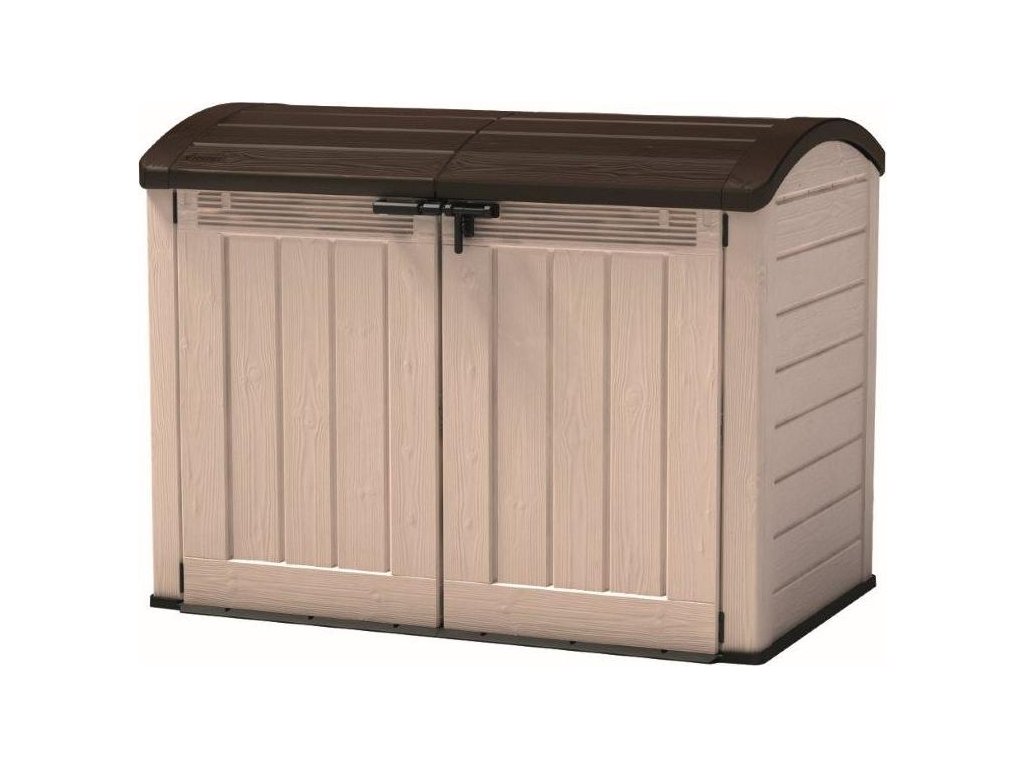 - Béžovo-hnědý přístřešek Keter Store-It-Out Ultra nabízí kapacitu 2 000 l pro uložení popelnic, kol, bazénové technologie a vybavení či zahradního nářadí