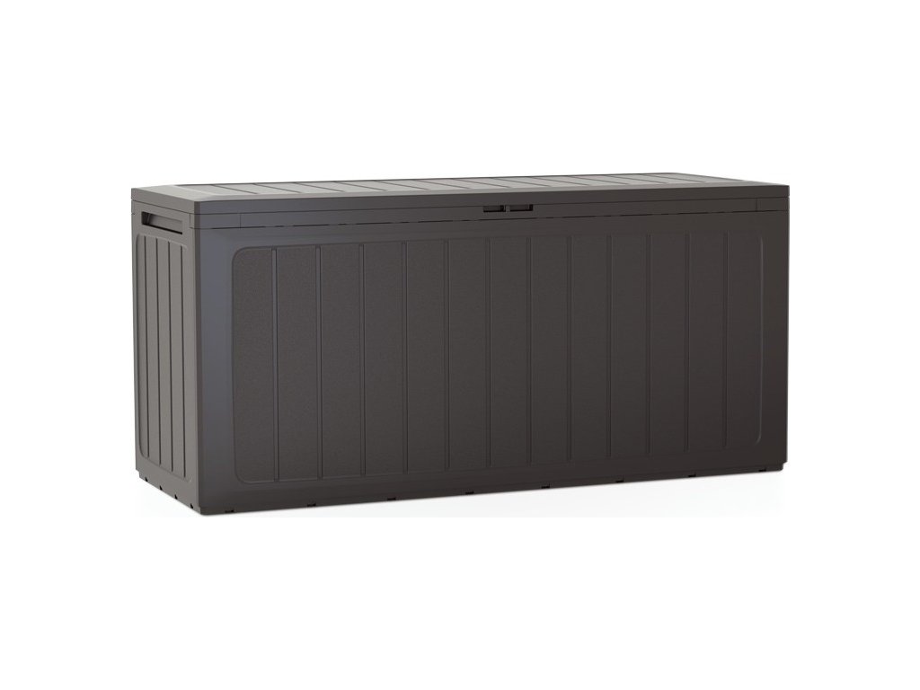 Praktický a stylový úložný prostor na zahradu nebo balkon – zahradní box Prosperplast BOXE BOARD o objemu 290 l nabízí dostatek místa pro podušky, nářadí nebo hračky. Odolný plastový materiál a moderní design v barvě umbra zaručí dlouhou životnost i estetické začlenění do exteriéru. Lehký, ale pevný box s rozměry 116,6 × 47 × 59,5 cm snadno sestavíte bez nářadí.