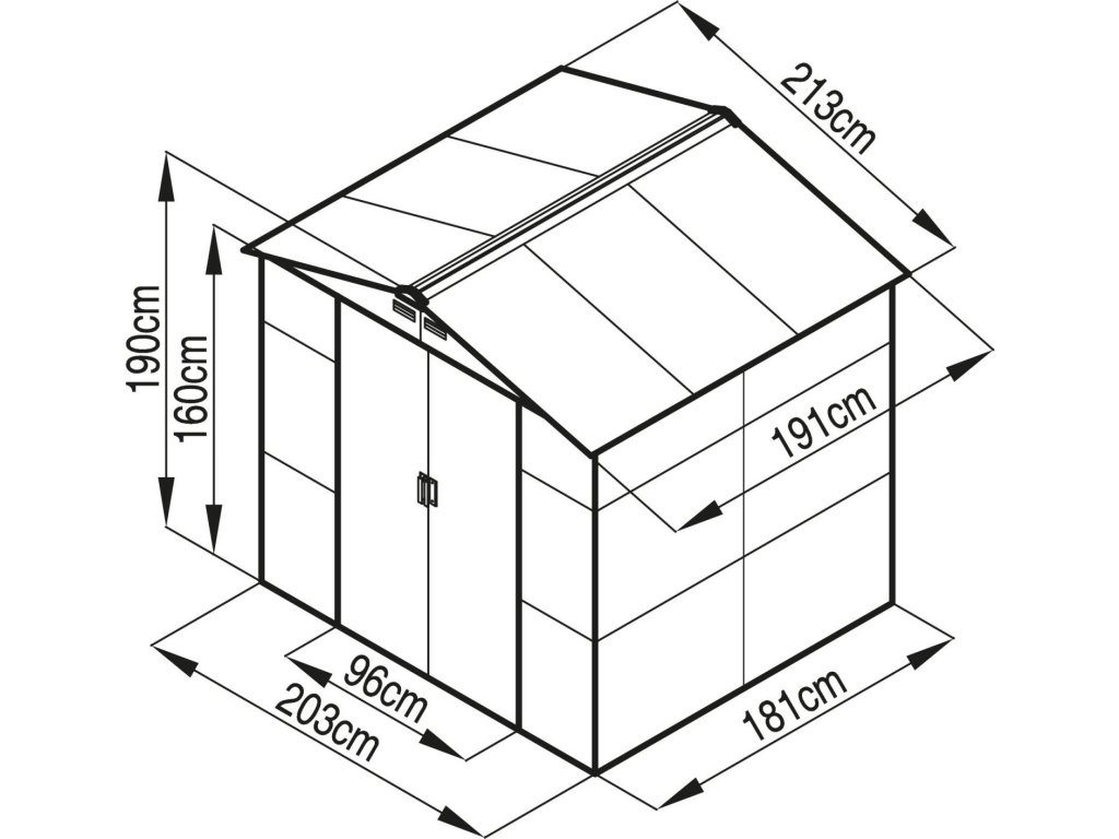 Šířka přední strany činí 213 cm, výška v nejvyšším bodě je 190 cm a šířka boční strany je 191 cm. Výška boční stěny bez střechy je 163 cm. Na přední straně se nachází dveře.