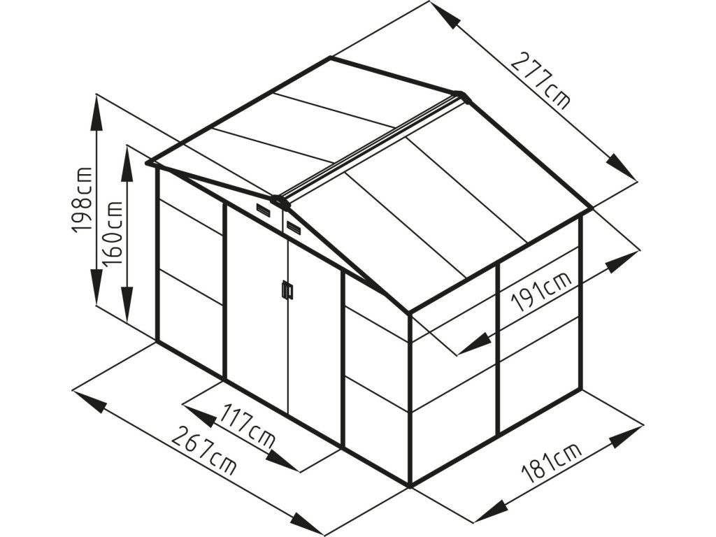 Šířka přední strany činí 277 cm, výška v nejvyšším bodě je 198 cm a šířka boční strany je 191 cm. Výška boční stěny bez střechy je 163 cm. Na přední straně se nachází dveře.