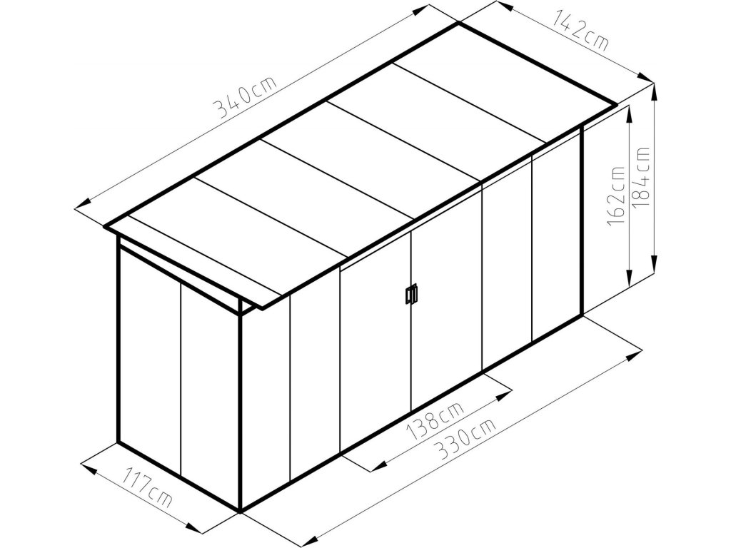 - Vnější rozměry – se střechou (š x d x v): 340 x 142 x 184 cm
