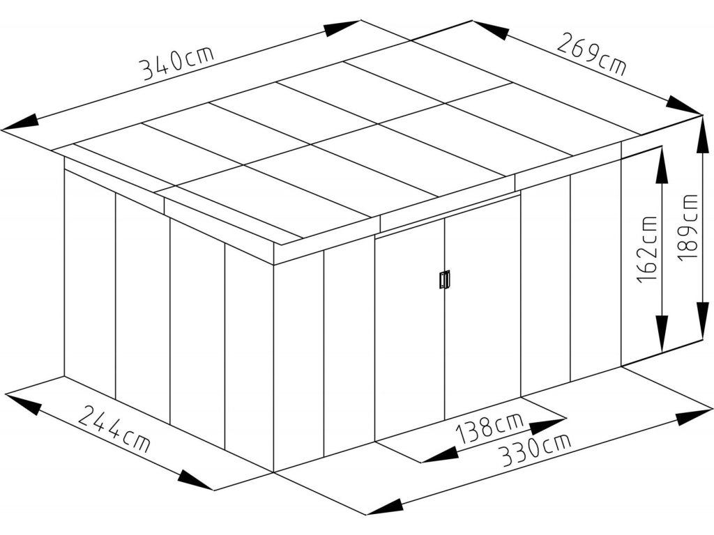 - Vnější rozměry – se střechou (š x d x v): 340 x 269 x 189 cm