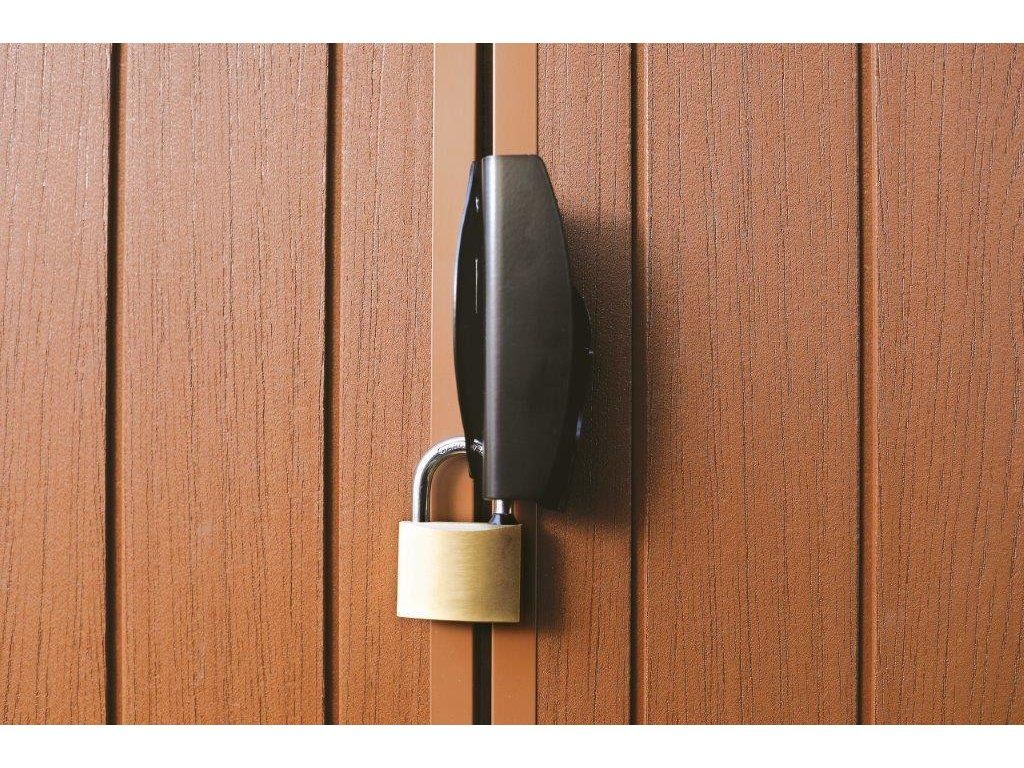Zahradní domek Keter Darwin je vybavený silnou sedlovou střechou, která vydrží zatížení až do 75 kg/m², takže hravě odolá i haldě sněhu. Má dvojité dveře, takže dovnitř uskladníte i rozměrnější věci – gril nebo třeba kolečko. Výrobce se také postaral o vhodný ventilační systém s regulovanou cirkulací vzduchu. Přední dveře jsou opatřeny ocelovou západkou, na kterou lze nasadit visací zámek pro větší bezpečnost.