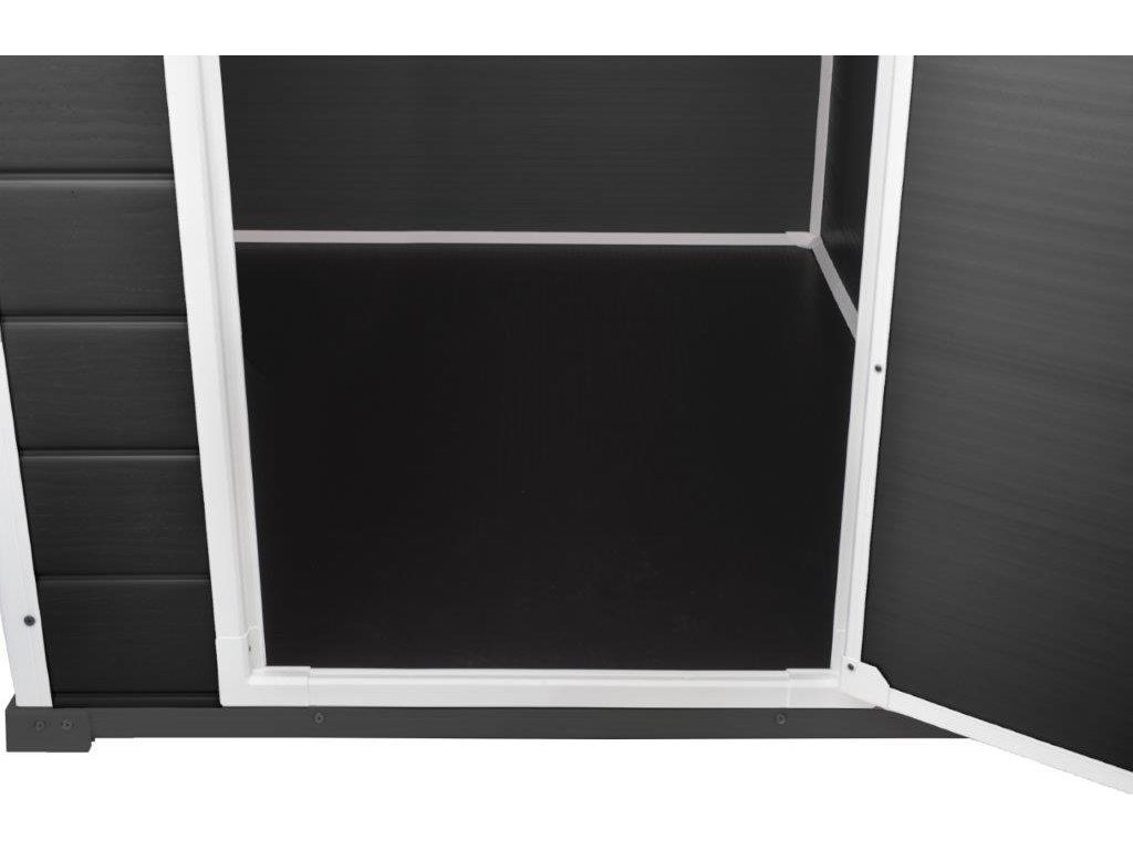 Součástí domku je vlastní podlahový panel, který chrání uložené předměty před vlhkem a nečistotami. Díky vestavěnému ventilačnímu systému je uvnitř zajištěno dostatečné proudění vzduchu, což zabraňuje vzniku plísní nebo kondenzaci vlhkosti. Uzamykatelné dveře pak chrání vše uvnitř před nepovolanými osobami.