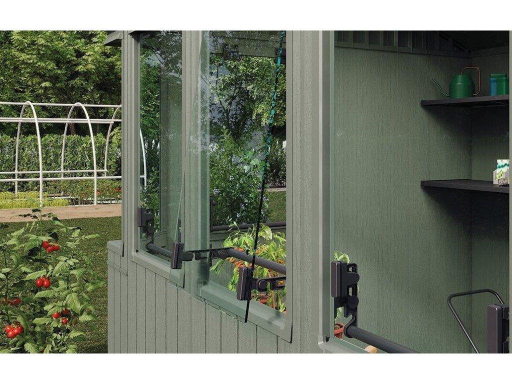 Chcete v domku rozšířit úložný prostor? Namontujte dovnitř 2 police (jsou součástí balení). Uskladníte na ně drobnější pomůcky a předměty. Kromě toho kdykoliv vyvětráte. O cirkulaci vzduchu se postará celkem 5 oken (s možností otevření na 7°).