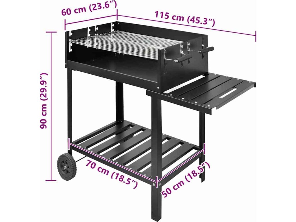 Tento zahradní gril je vybavený 2 grilovacími mřížkami, které společně vytváří grilovací plochu o rozměrech 70 x 50 cm, což je relativně velký prostor pro přípravu vašich pokrmů. K dispozici je postranní police a spodní police, kam si můžete odkládat vaše grilovací příslušenství. 2 kolečka, kterými je gril vybaven, usnadňují přemísťování zahradního grilu.