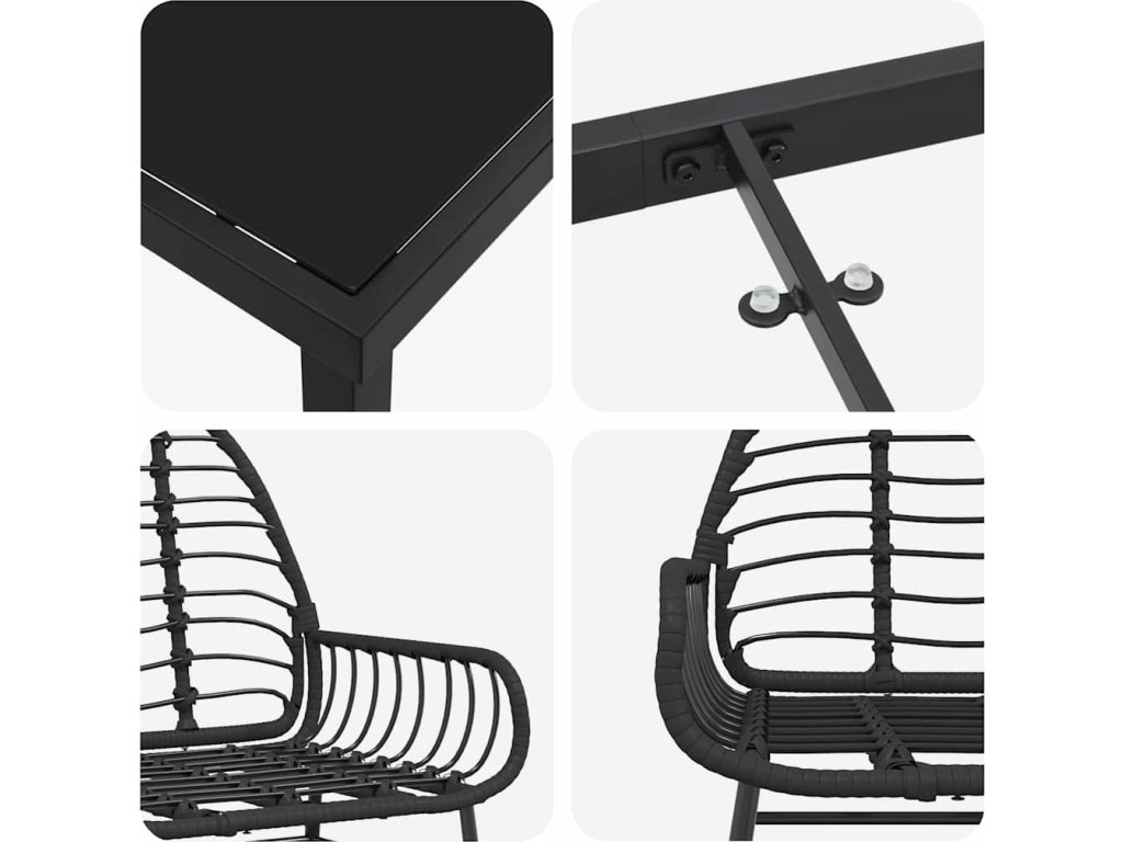 - Zahrnuté komponenty: Skleněné stolní desky jsou elegantní a trvanlivé. Opěrky z poly ratanu jsou pohodlné a stabilní nohy zaručují, že souprava je pevná na každém povrchu. Takže užijete si stylové venkovní stolování.