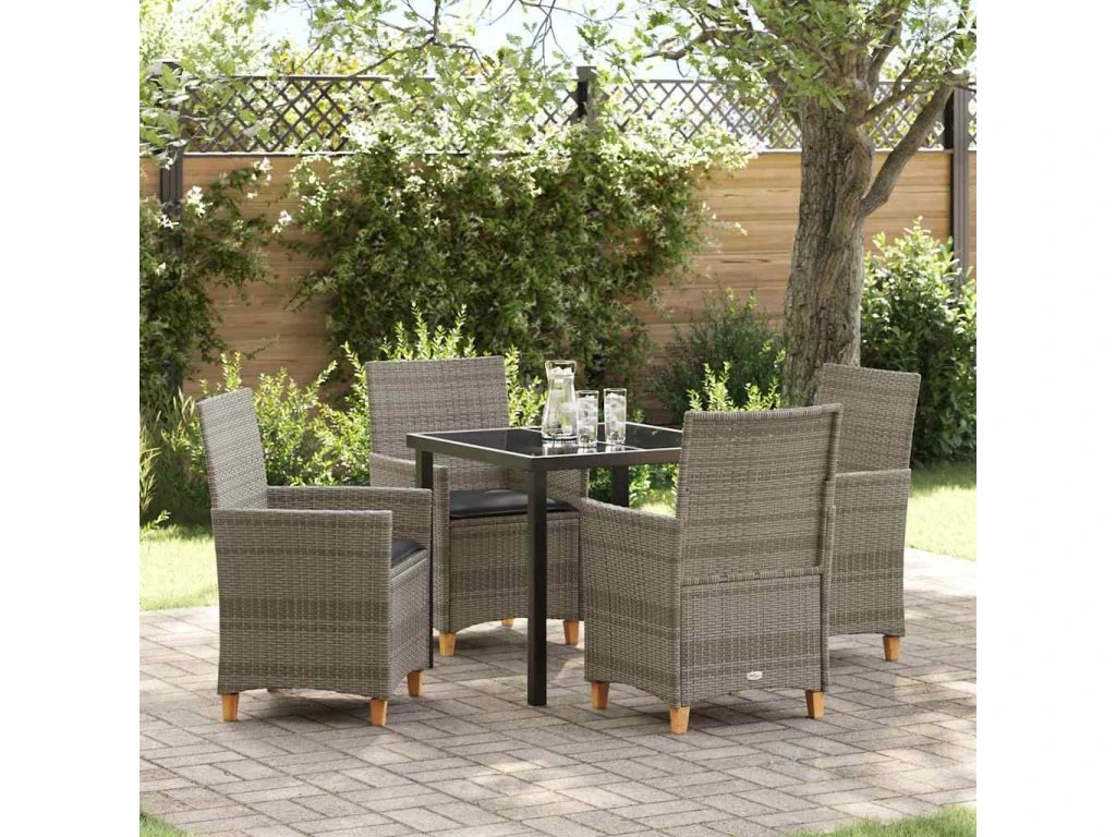 - Materiály: Tenhle jídelní set má skvělou kombinaci polyratanu, oceli a skla. Polyratan odolává špatnému počasí, ideální pro venkovní použití. Ocelový rám poskytuje pevnou oporu a zajišťuje stabilitu. Skleněná deska dodá modernímu stylu elegantní dotek.