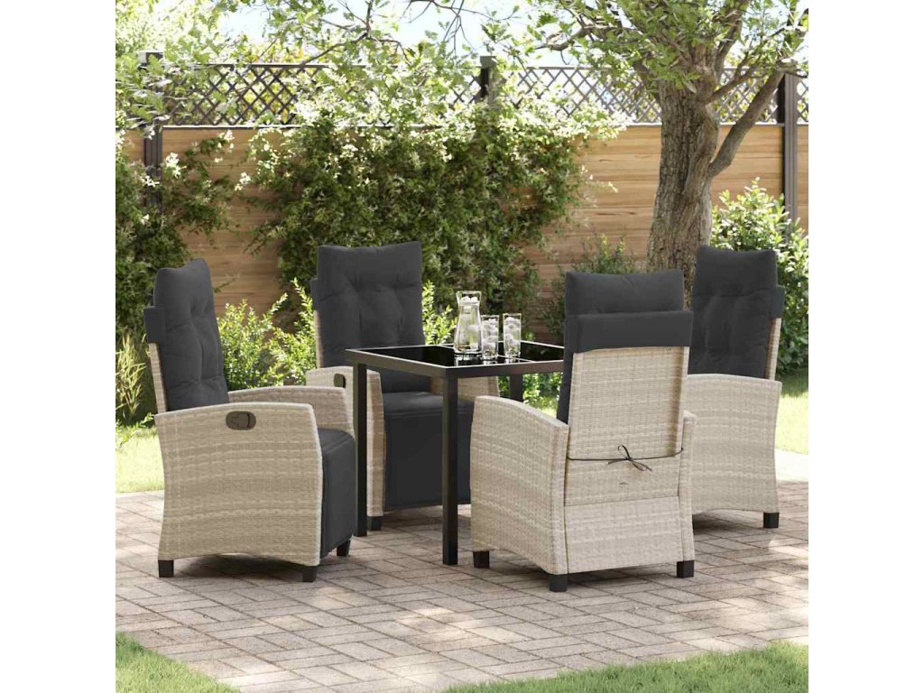 - Materiály: Set je vyroben z poly ratanu a odolné oceli. Poly ratan přináší moderní tkanou texturu, která kombinuje estetiku a odolnost, a ocelová konstrukce zajišťuje stabilitu a výdrž během proměn počasí.
