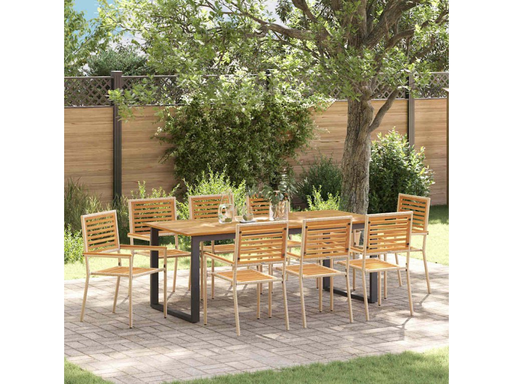- Akáciové komponenty: Obsahuje akáciové opěrky, záda, sedáky a povrchy, které kombinují krásu s pevností a dodávají přírodní vzhled všem zahradním prostorům.