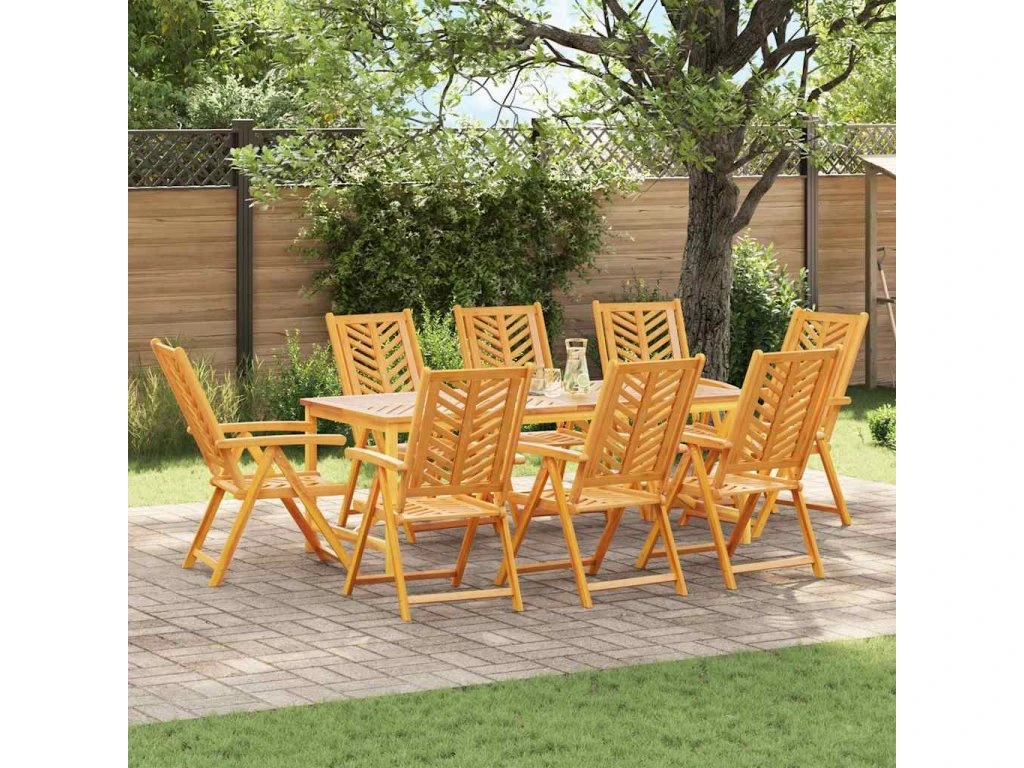 Zahradní jídelní sada má moderní vzhled, který je ideální pro venkovní relaxaci. S elegantním stylem a funkční estetikou doplňuje každou zahradu krásou a užitečnými prvky. Perfektní pro odpočinek na vaší zahradě nebo terase, sada se vyznačuje příjemným hnědým odstínem na opěradlech, nohou a povrchu, vše z odolného masivního akáciového dřeva. Tento stylový komplet zvýší vaše venkovní sezení, zaručí trvalé dojmy a nabídne útulné útočiště v přírodě.