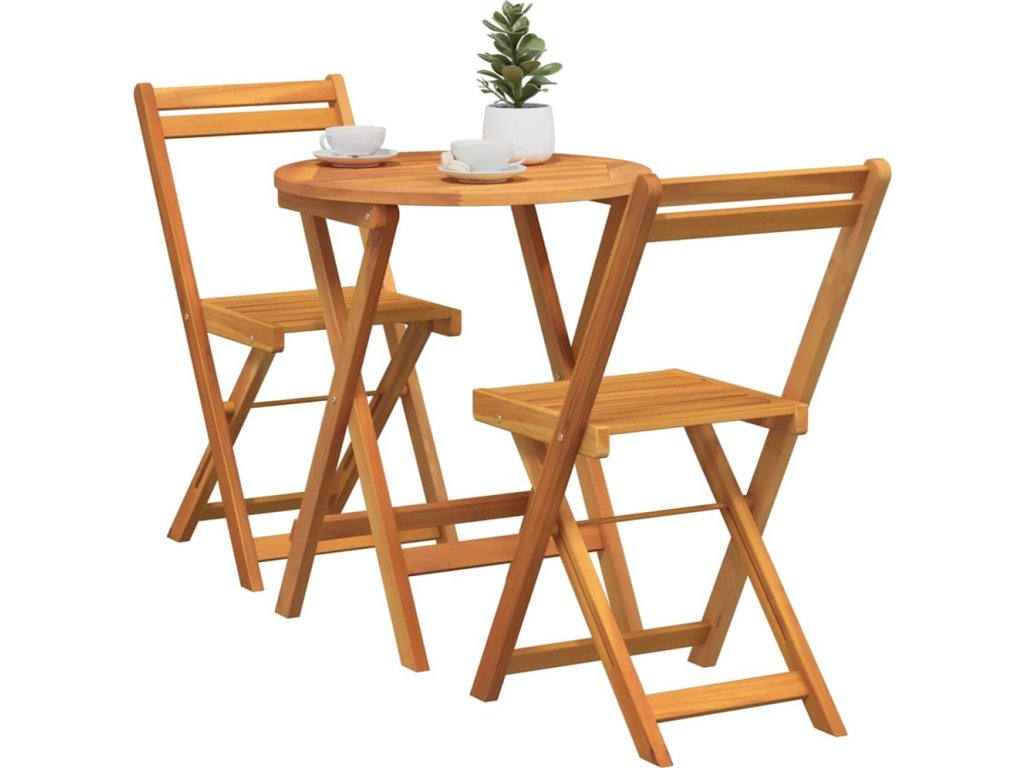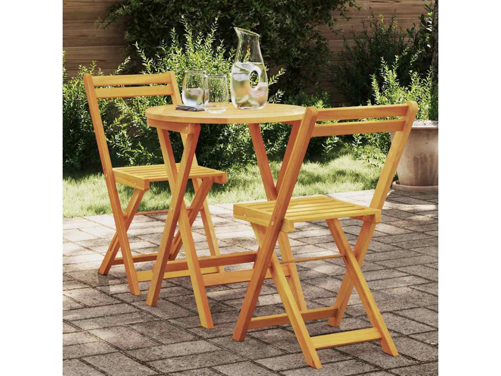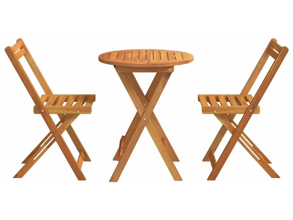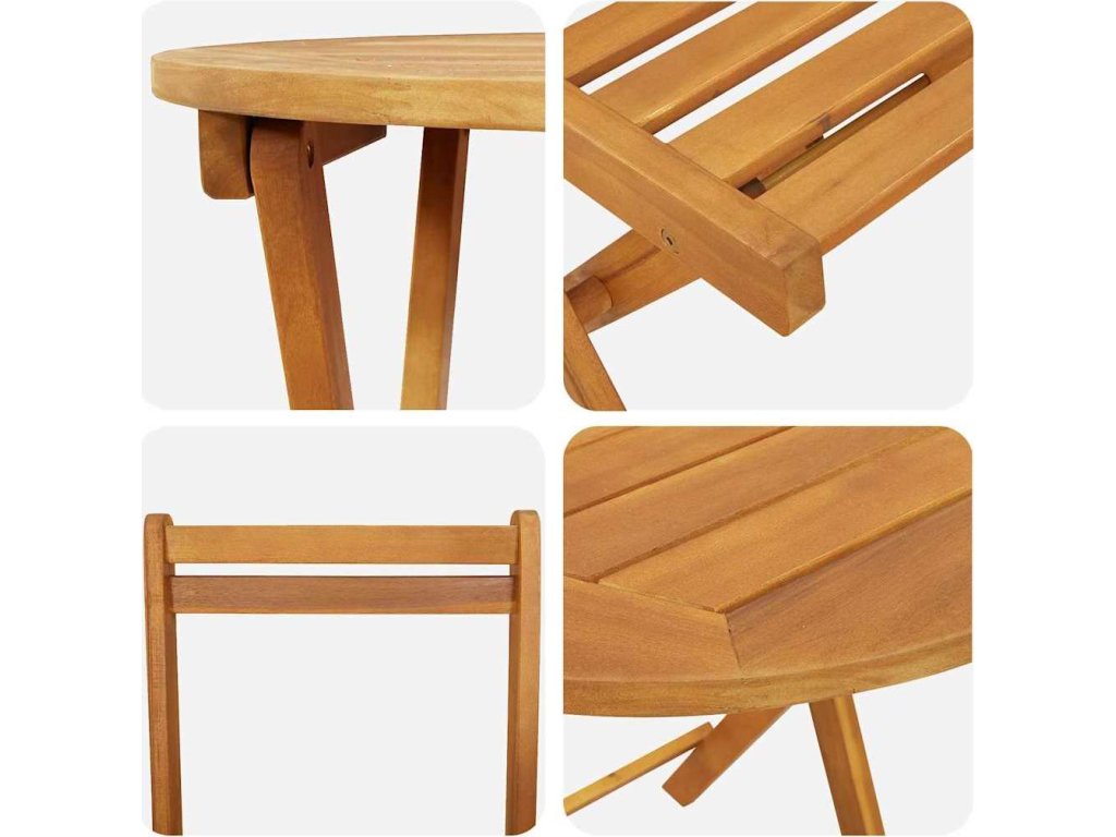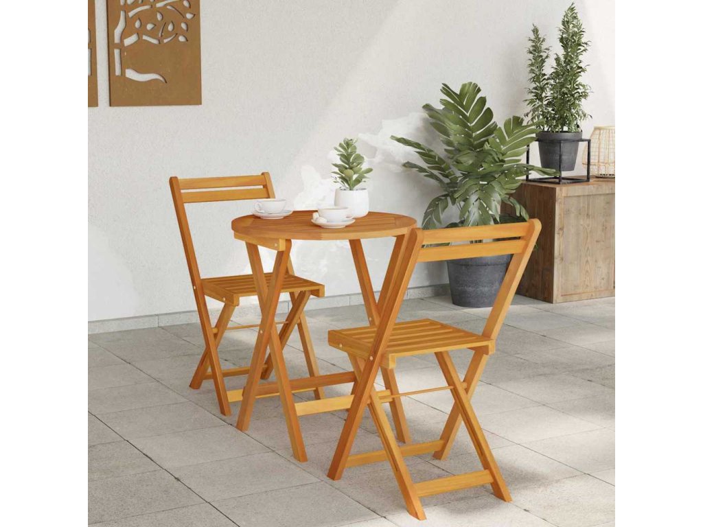 - Robustní komponenty: Obsahuje zahradní stůl a dvě ergonomické židle pro lepší pohodlí. Rám a povrch jsou vyrobeny z masivního akáciového dřeva, proslulého svou silou a odolností. Každá židle má venkovní polstrovaný sedák, který odolává počasí.