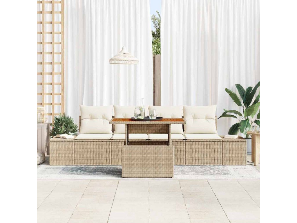 - Prémiové materiály: Tato jídelní sada je vyrobena z vysoce kvalitního poly ratanu, známého pro svůj moderní styl a odolnost. Rám z práškově lakované oceli a masivního dřeva akácie poskytuje robustní strukturu, která zajišťuje stabilitu proti vnějším silám a povětrnostním podmínkám, zatímco kombinované materiály nabízejí skutečný přírodní vzhled.