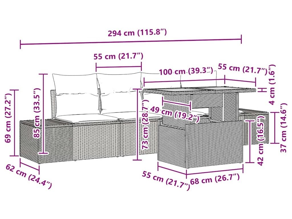 - Obsahované komponenty: Sada zahrnuje dvě boční pohovky a dvě centrální sedadla, z nichž každé má praktickou úložnou funkci. Tento promyšlený design zvyšuje funkčnost a umožňuje snadné uložení venkovních potřeb a udržení prostoru v pořádku, ideální pro moderní venkovní život.