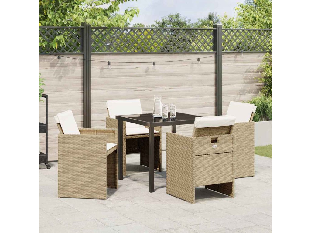 - Materiály: Set je ze polyratanu, známého svou odolností vůči počasí. Povrch stolu z tvrzeného skla je snadno omyvatelný a vypadá elegantně. Práškově lakovaná ocel posiluje rám a nohy, takže je to robustní konstrukce, která utáhne i drsnější podmínky.