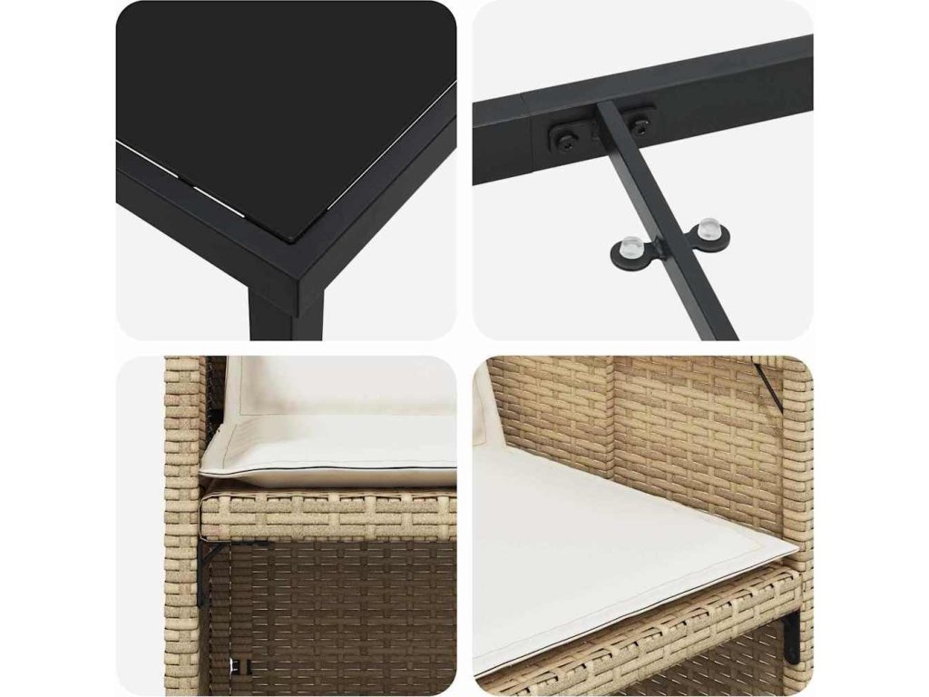 - Materiály: Set je ze polyratanu, známého svou odolností vůči počasí. Povrch stolu z tvrzeného skla je snadno omyvatelný a vypadá elegantně. Práškově lakovaná ocel posiluje rám a nohy, takže je to robustní konstrukce, která utáhne i drsnější podmínky.