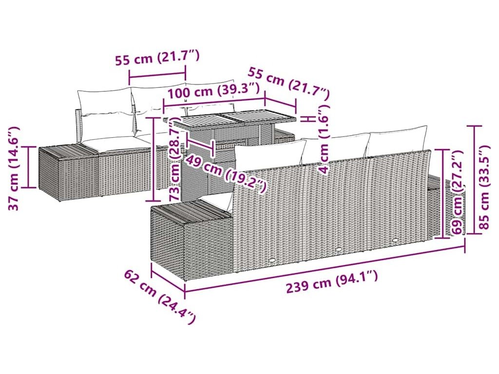 - Kompletní jídelní souprava: Sada obsahuje čtyři boční pohovky se skladováním a centrální zahradní stůl, všechny navržené tak, aby splnily tvé praktické potřeby při venkovních jídlech, večírcích nebo klidných odpoledních. Každá součást je navržena tak, aby vyhověla různému počtu hostů a poskytla pohodlí v každém uspořádání sezení, podporující funkčnost a eleganci.