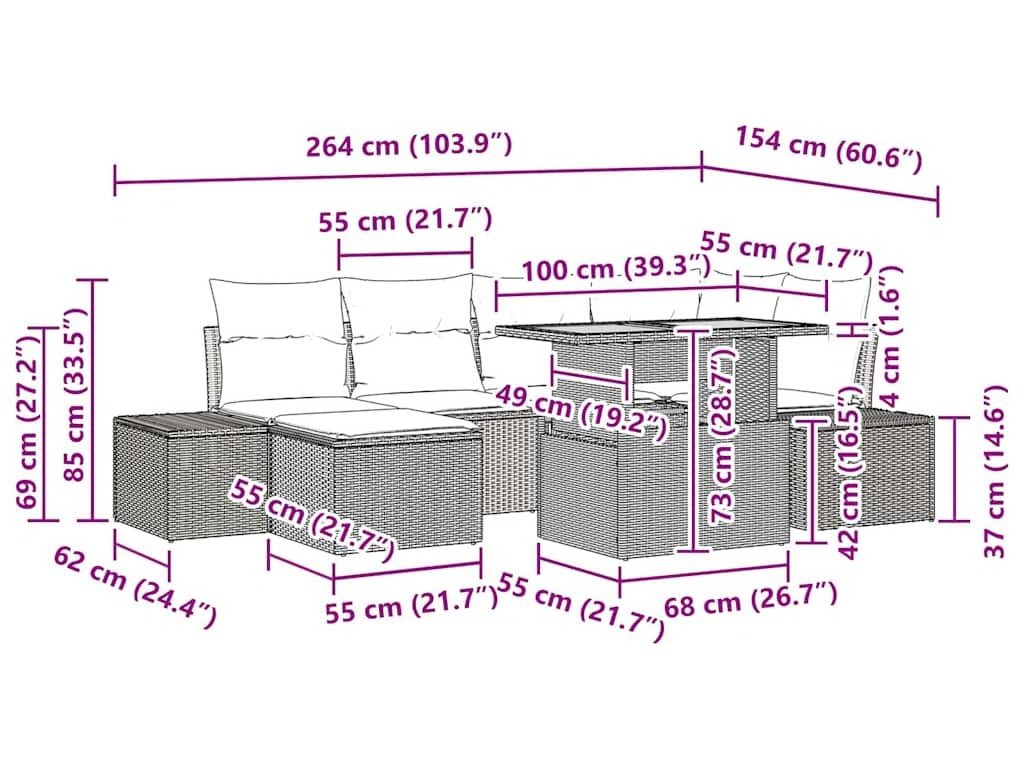 - Chytré úložné možnosti Přijměte funkčnost s chytrými integrovanými úložnými řešeními. Rohové a boční pohovky spolu s taburetem mají výhodné úložné prostory. Tyto skryté prostory jsou ideální pro ukládání venkovních nezbytností, jako jsou polštáře nebo deky. Tato praktická funkce pomáhá udržovat pořádek a rychle uklidit vaši venkovní oblast, aby bylo vše vždy po ruce.