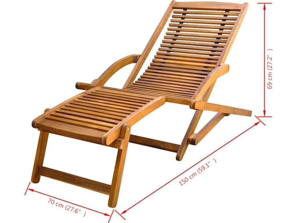 Toto zahradní lehátko je vyrobeno z vysoce kvalitního akáciového dřeva, tropického tvrdého dřeva, které je odolné vůči povětrnostním vlivům a velmi trvanlivé. Podnožka poskytuje místo na vaše nohy pro větší pohodlí. Lehátko se dá složit, abyste ušetřili místo, když je zrovna nepoužíváte.