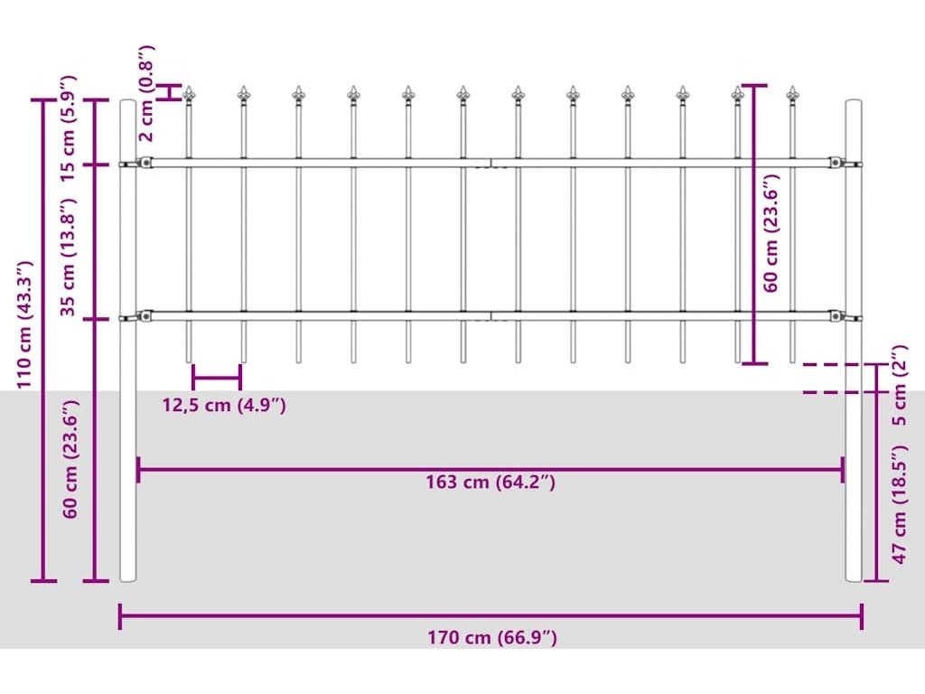 Tento panel zahradního plotu je jak praktický, tak hezký způsob, jak oddělit váš venkovní prostor. Vyrobený z práškově lakované oceli, je odolný pro venkovní použití a lehce ladí s různými zahradními uspořádáními. Díky obdélníkovému tvaru efektivně vymezuje hranice pozemku nebo vytváří uzavřené zahradní sekce. Vylepší vzhled vaší zahrady a zároveň nabízí potřebnou ochranu a soukromí uprostřed přírody.
