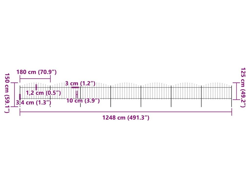 Zahradní plot s kopím nahoře ocelový 1248 x 150 cm černý [277736]