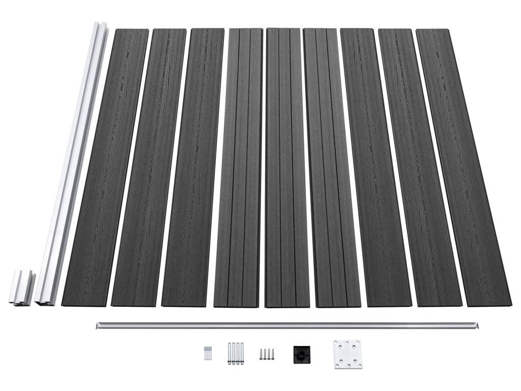 - Materiál: WPC (dřevoplast), hliník, ocel