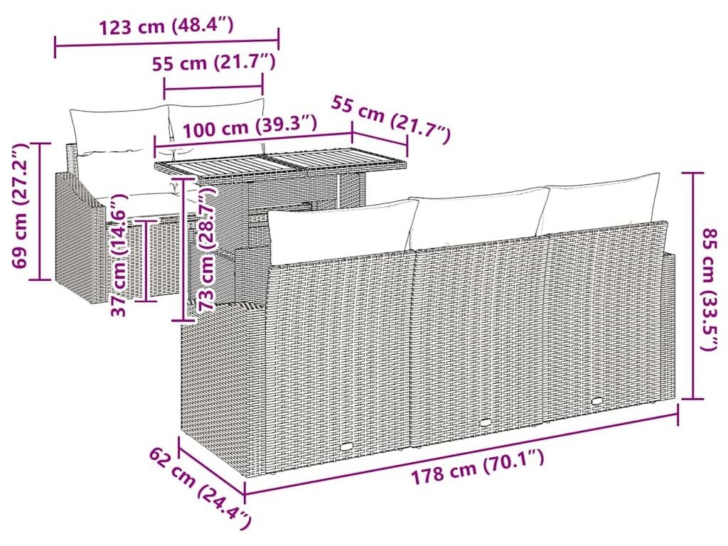 - Praktické úložiště: Integrované úložiště v sedacích jednotkách umožňuje bezpečné a suché uskladnění venkovních nezbytností. S polštáři se zipem zajišťujícími snadné odstranění a čištění zůstává váš prostor bez nepořádku. Uložte nesezené dekorativní polštáře nebo mějte venkovní hry dostupné mezi akcemi a optimalizujte funkční prostor.