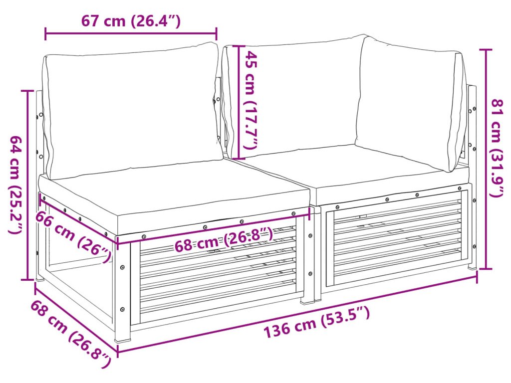 - Rozměry středové pohovky: 64 x 68 x 64 cm (Š x H x V)