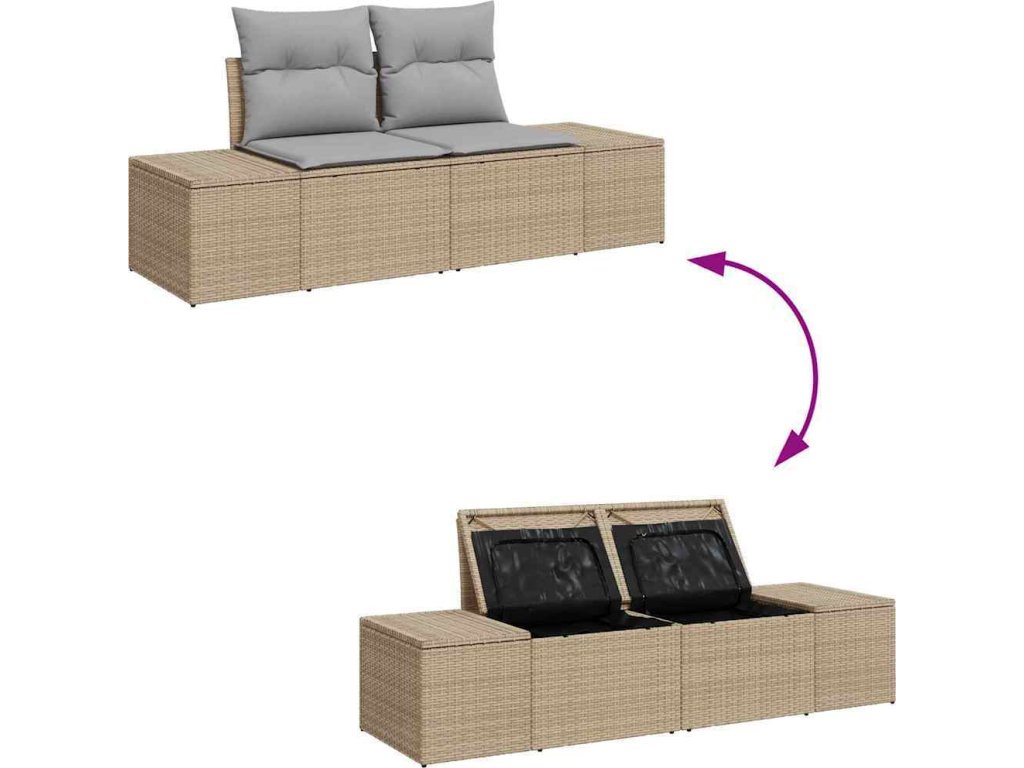 - Funkční komponenty: Set obsahuje stůl s nastavitelnou výškou, který jednoduše přetvoříte z konferenčního stolu na jídelní stůl. UV-odolné modulární sofa sekce se přizpůsobí jakékoli příležitosti, a skryté úložné prostory zajišťují styl i funkčnost.