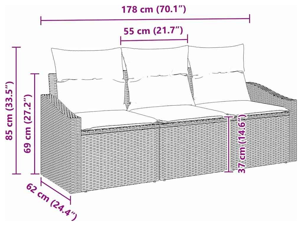 - Komplexní komponenty: Sada se skládá ze střední sedačky, dvou opěrných pohovek a pohodlných polstrů. Důmyslně zpracovaný poly ratan na zadních a opěrných stranách vytváří ucelený vzhled, zatímco práškově lakovaná ocelová konstrukce dodává stabilitu a dlouhou životnost.