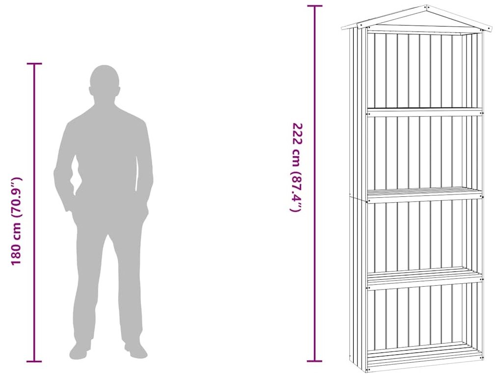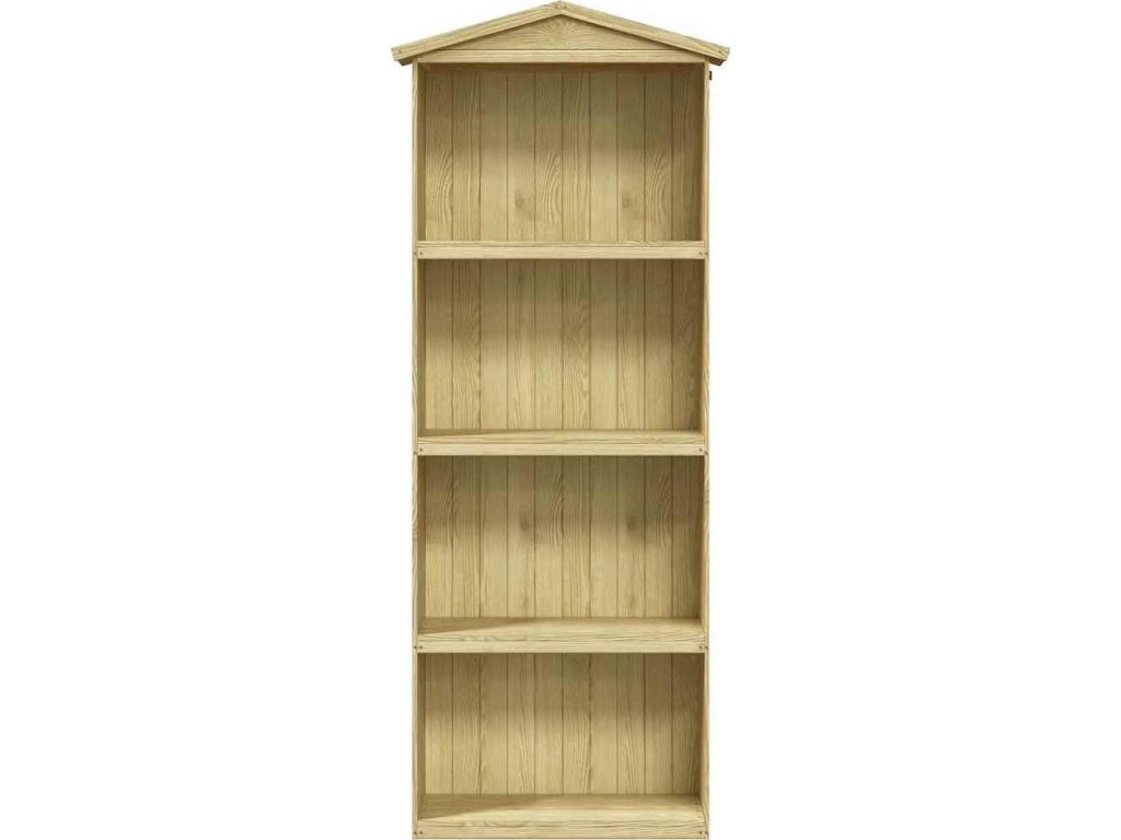Tento úložný regál z kvalitního impregnovaného borového dřeva má mimořádně dlouhou životnost a je odolný vůči povětrnostním vlivům. Střecha je pokryta asfaltovou plstí, která chrání přístřešek před vlhkostí. V přístřešku jsou 4 velké otevřené police, kam si můžete ukládat konve, hrábě, lopaty nebo jiné zahradní nářadí a další předměty a skladovat je přehledně organizované.