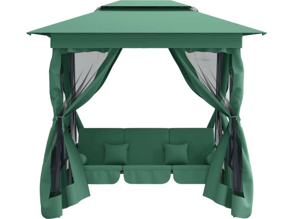 Pokud chcete více soukromí, můžete zatáhnout závěsy ze všech čtyř stran, nebo je naopak roztáhnout a zajistit je poutky na suchý zip. Závěsy se síťovinou vás ochrání nejen před cizími pohledy, ale také před dotíravým hmyzem. Sedadlo je možné rozložit na postel. Součástí balení jsou dva obdélníkové polštáře a dva polštáře válce pro optimální komfort.