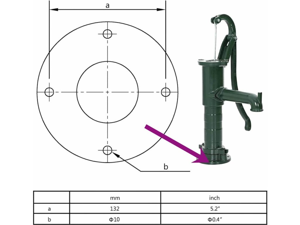 Práce s touto ruční pumpou je velmi snadná. S rukojetí pohybujte nahoru a dolů, čímž bude voda čerpána ze země a bude vytékat z vodovodního kohoutku. Toto ruční čerpadlo lze snadno instalovat a namontovat. Při hmotnosti 10,5 kg je pumpa velmi odolná a bude vám sloužit po mnoho let.