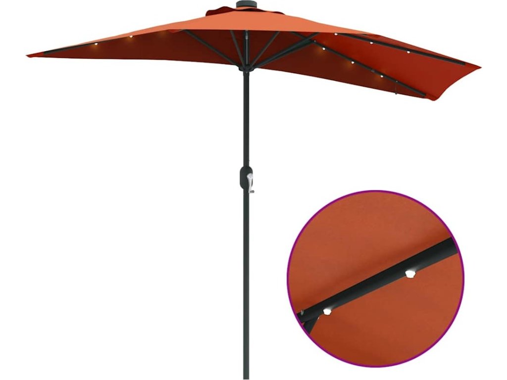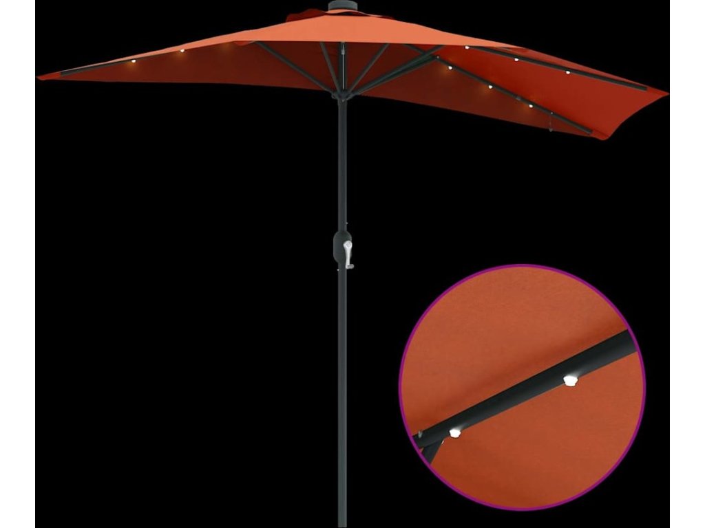 - Funkce / Design: Skládací design usnadňuje ukládání, když se slunečník nepoužívá. Ruční klička umožňuje pohodlné otevírání a zavírání, což zvyšuje usability. Solární LED osvětlení poskytuje osvětlení na noc bez nutnosti externích zdrojů energie.