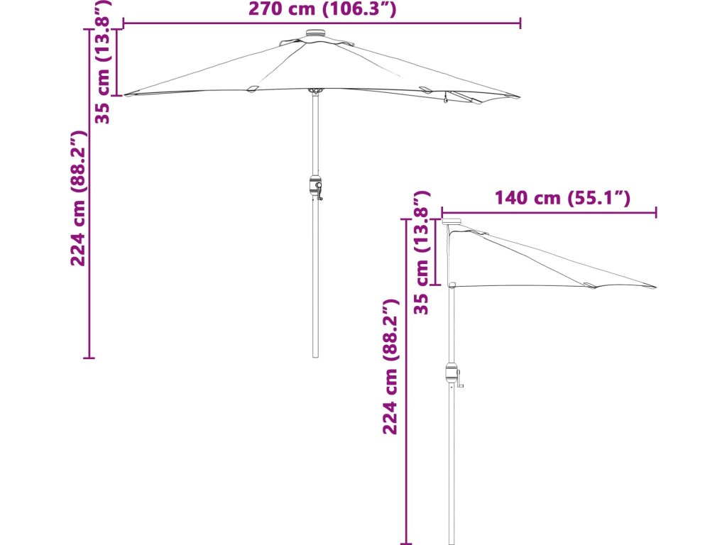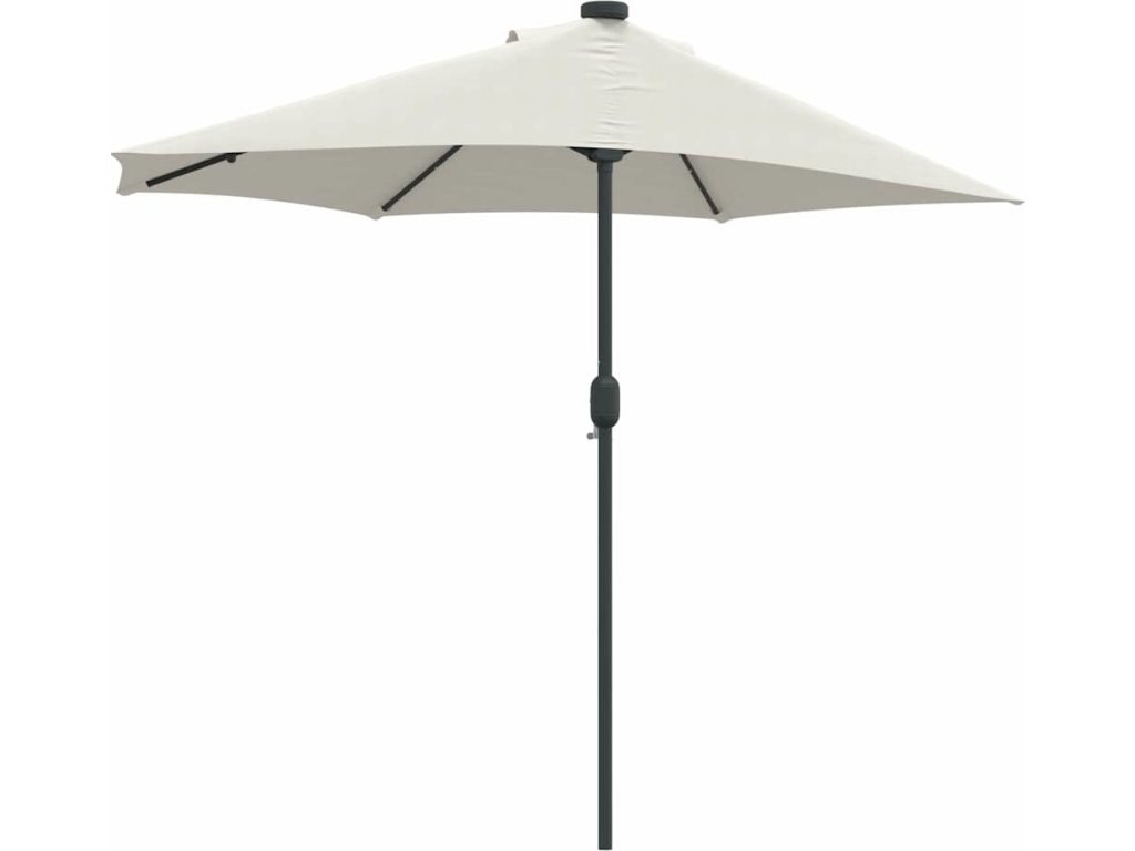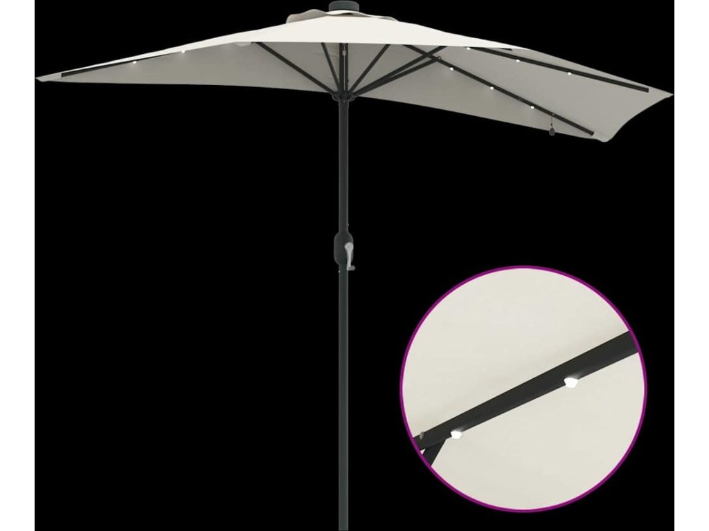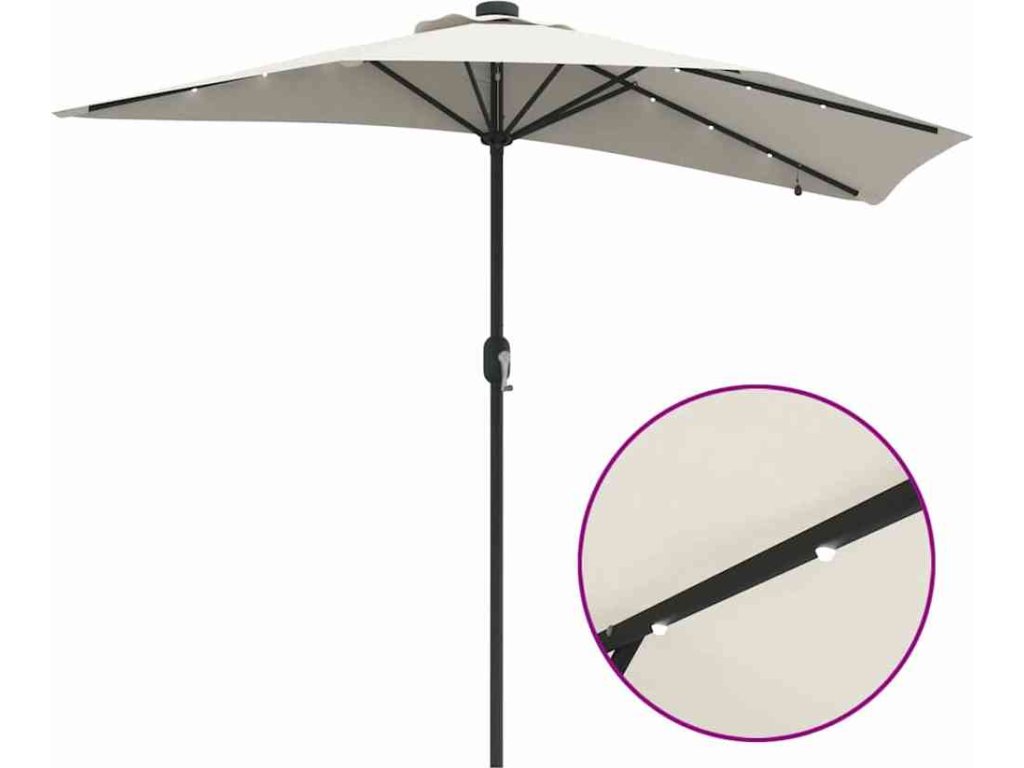 - Součásti: Tento zahradní slunečník přichází s manuální kličkou a skládacím mechanismem pro snadné otevření a uskladnění. Integrované solární LED osvětlení dodává magickou atmosféru při večerních setkáních. Řetězová světla navíc přidávají příjemný lesk pro speciální příležitosti.