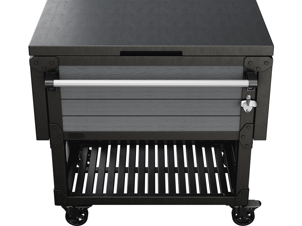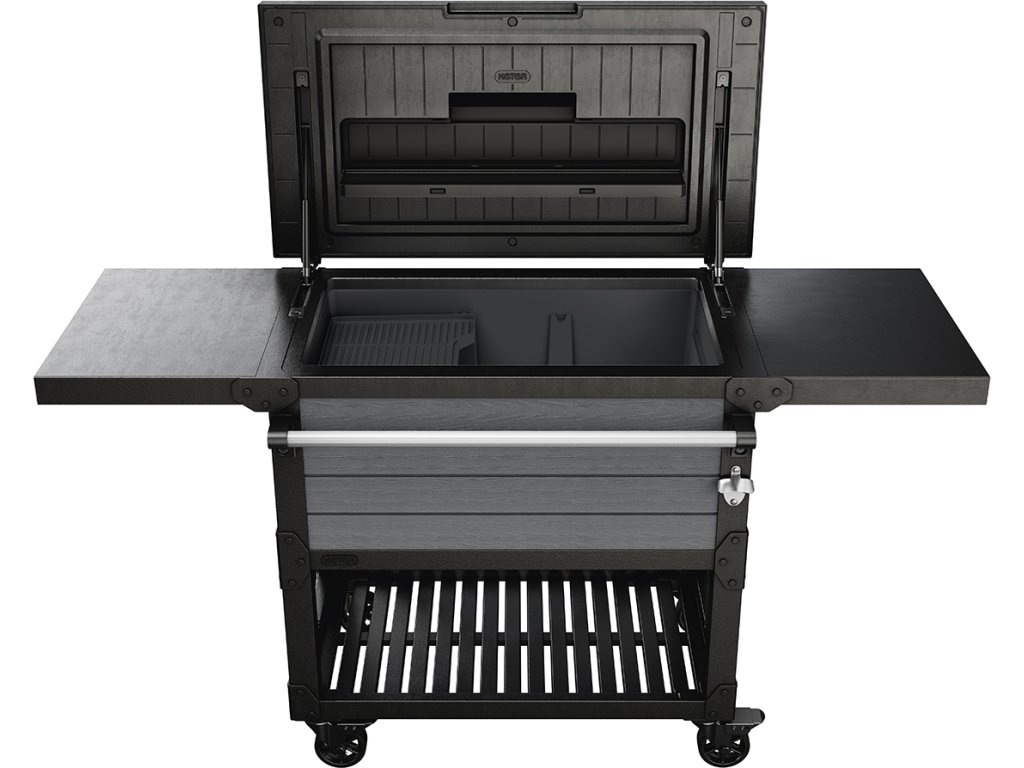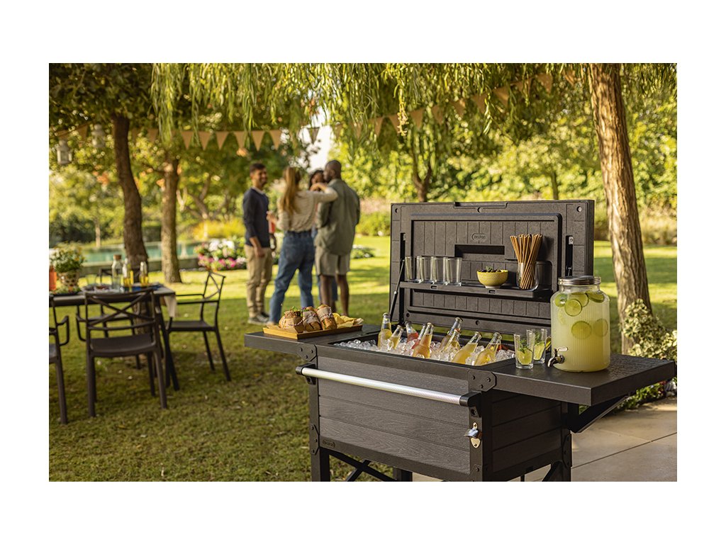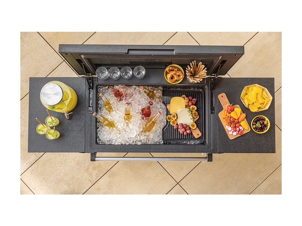 Vnitřní část stolu využijete jako úložný prostor. Můžete do něj nasypat led a vychladit láhve s pitím. Pohyblivou přepážkou oddělíte kostky ledu od jídla. Nebo ji vyndáte a použijete ji jako tác. Součástí stolku je také otvírák na lahve.