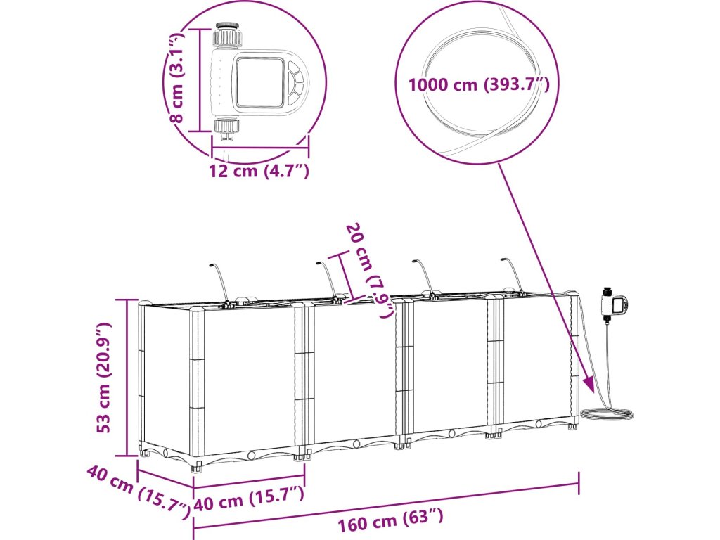 Zahradní truhlík se zavlažováním je ideální pro ty, kdo hledají praktickou a hezkou možnost do svého venkovního prostoru. S moderním a elegantním designem se bezproblémově hodí do jakékoli zahrady nebo na terasu. Zaměřuje se na jednoduchost a funkci, takže dodává vašim rostlinám styl, ať už jste zkušený zahradník, nebo začátečník. Tento truhlík spojuje styl a užitečnost a vytváří hezké prostředí pro vaše botanické projekty.